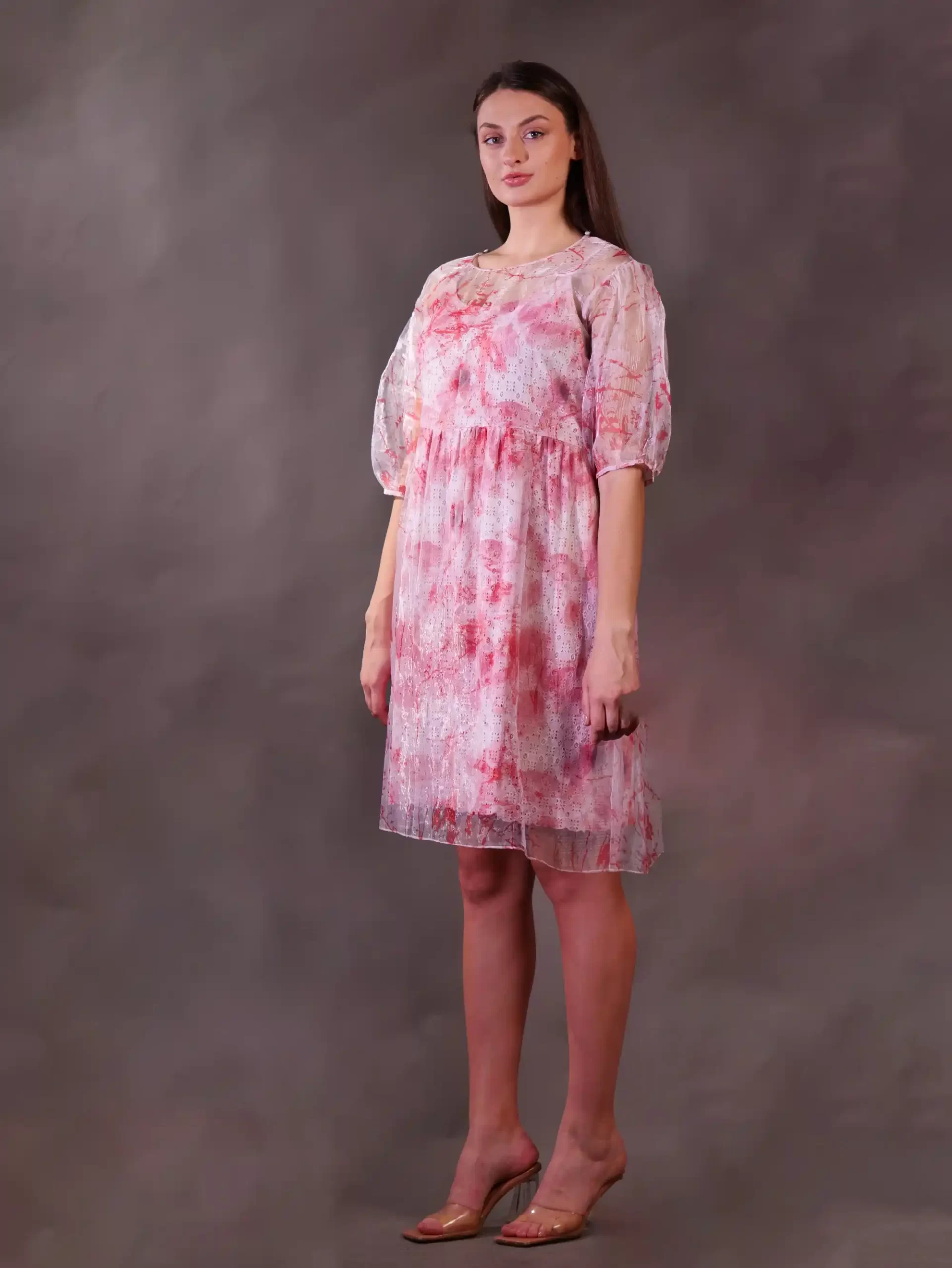 - Organza Printed Dress layered over Schiffli Slip Dress